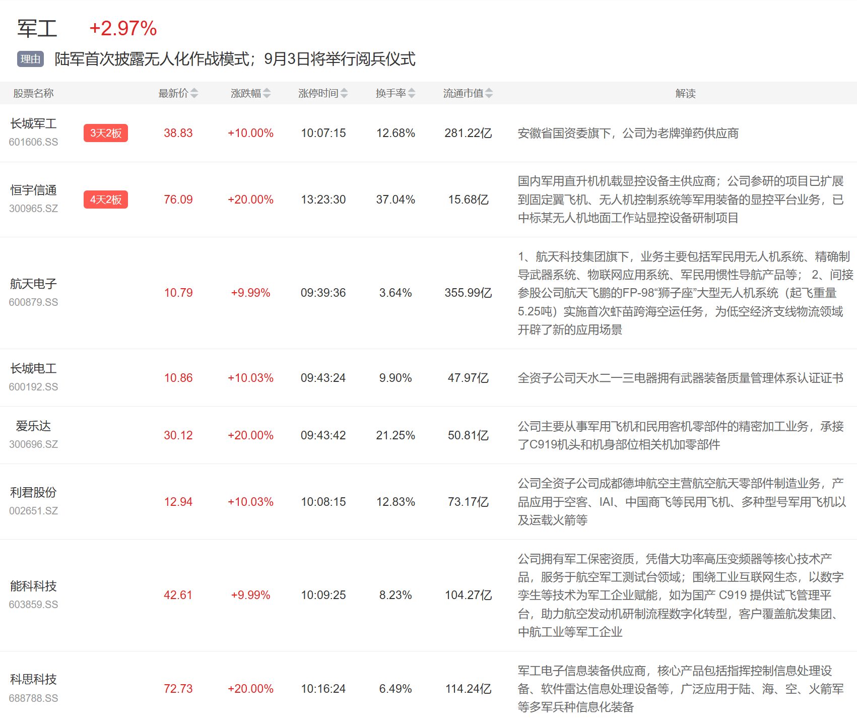 军工板块今日大涨,恒宇信通、航天电子等多股涨停。前期辨识度个股长城军工、北方长龙等再创历史新高。