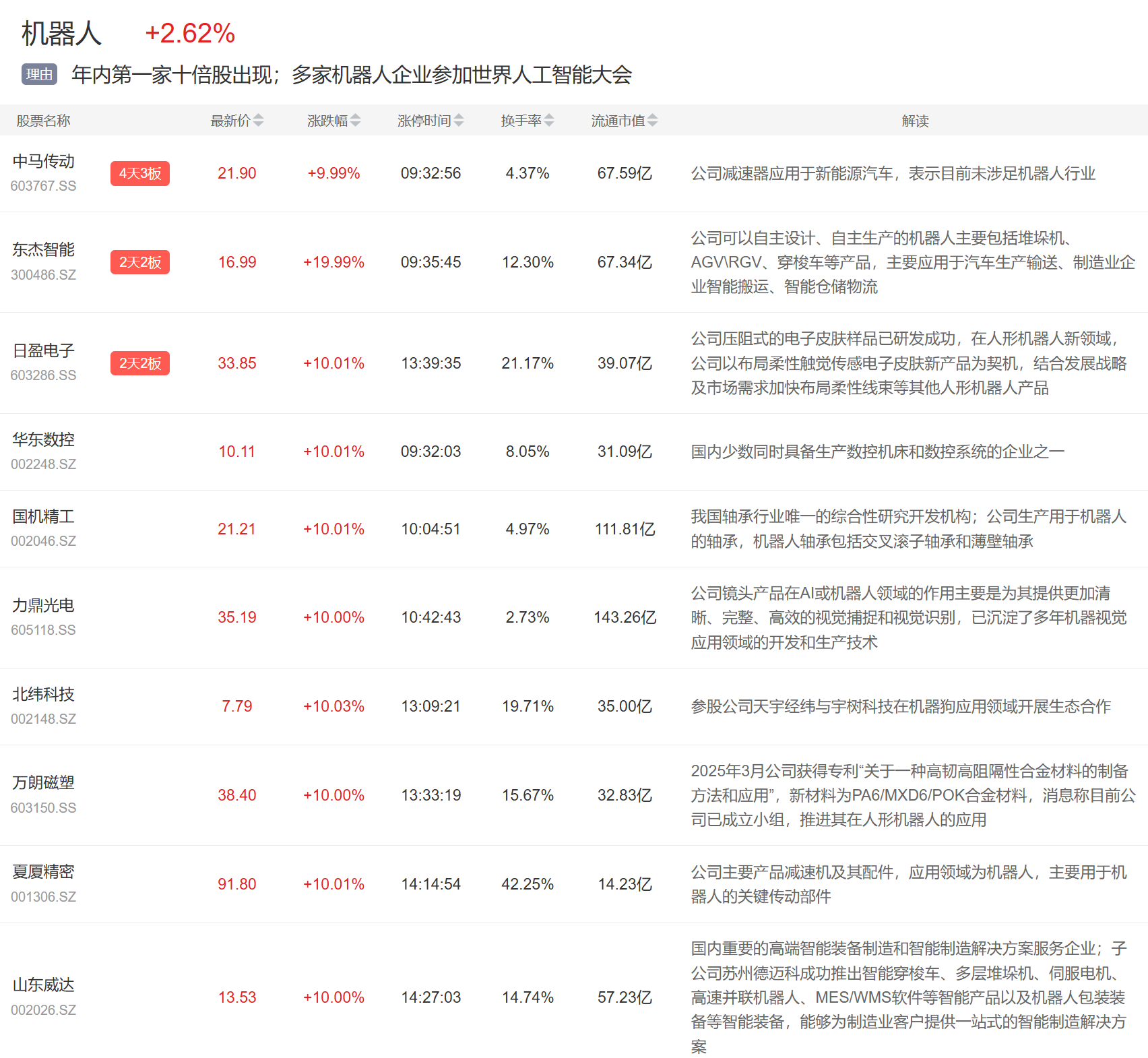 机器人板块今日再度大涨,中马传动、东杰智能、日盈电子等连板,国机精工、力鼎光电等涨停。