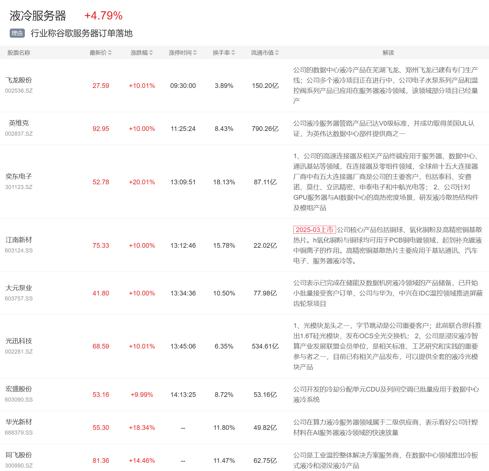 液冷服务器概念今日大涨,飞龙股份、英维克、奕东电子等多股涨停,其中英维克创历史新高。