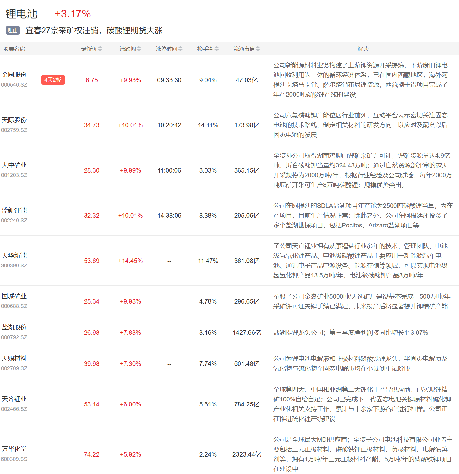 锂电池板块今日反弹,金圆股份、天际股份、大中矿业等多股涨停。