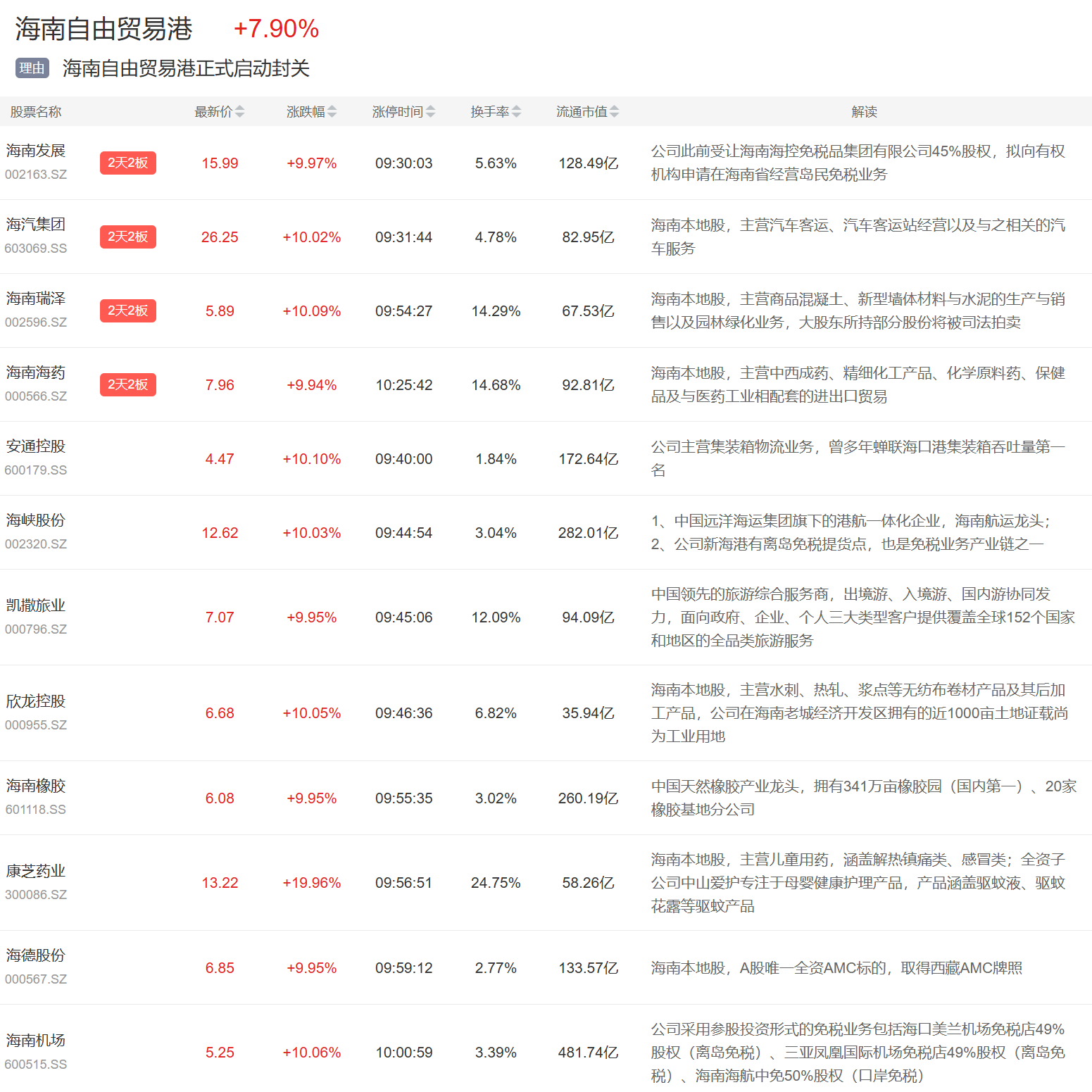 海南自贸港概念今日掀涨停潮。海南发展、海汽集团、海南瑞泽等多股连板,中国中免、海马汽车等多股涨停。
