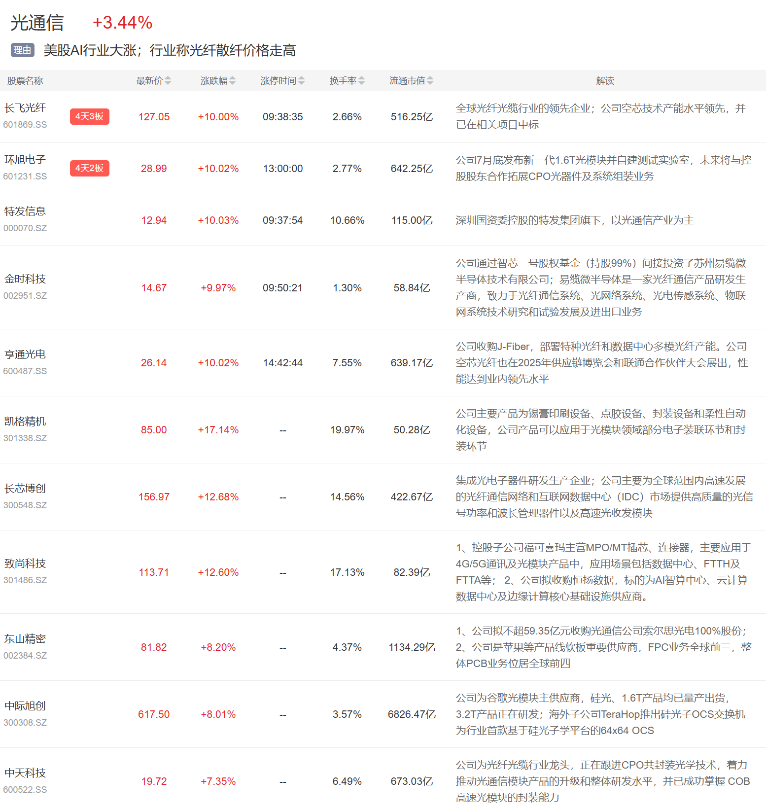 光通信概念今日大涨,长飞光纤4天3板,环旭电子、特发信息、亨通光电等涨停。