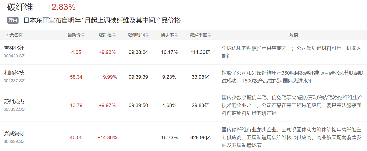 碳纤维板块今日表现,吉林化纤、和顺科技、苏州龙杰等多股涨停。