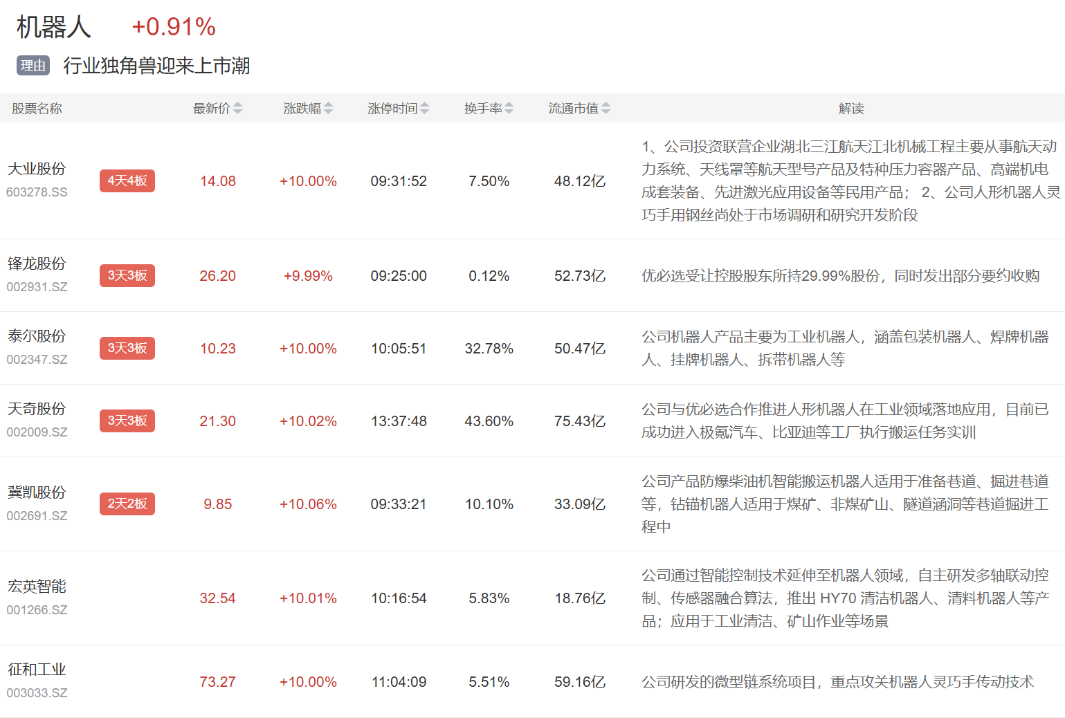 机器人板块今日大涨,大业股份4连板,锋龙股份、天奇股份3连板,征和工业涨停。