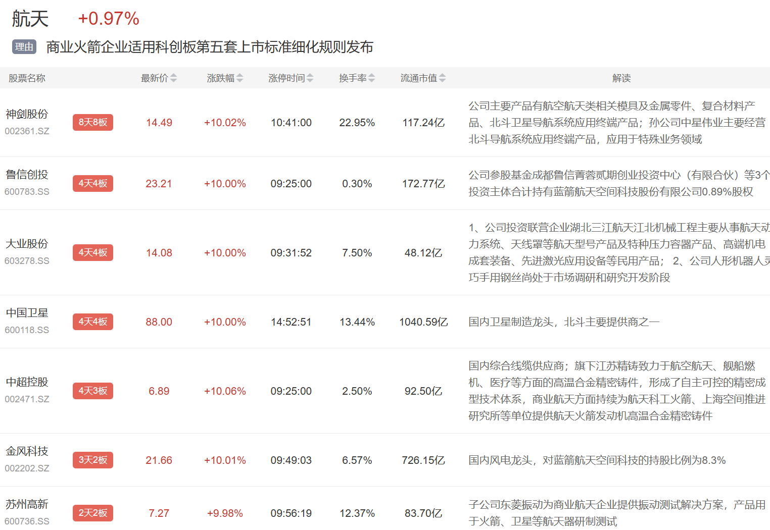 航天板块近日继续强势,神剑股份8连板,鲁信创投、中国卫星4连板,其中中国卫星市值突破1000亿创历史新高。其余多股连板或者涨停。